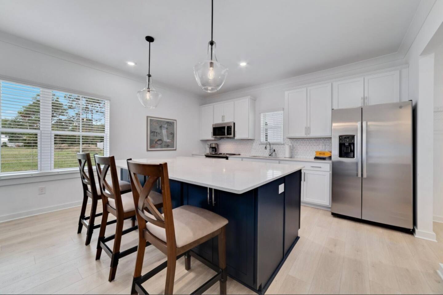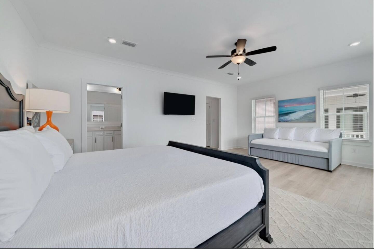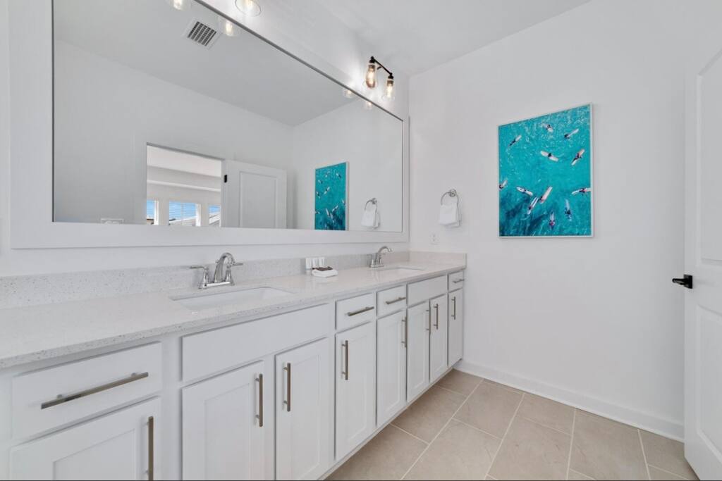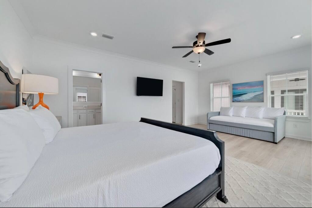 ☀ 2 car garage ☀ Fast 1Gig, free Wi-Fi ☀ Air conditioning + heating ☀ Washer/dryer included Welcome to The Orangery, your perfect retreat along Wolf Bay! This beautiful home features an open-concept living area filled with natural light. ☆☆ BEDROOMS ☆☆ Each of the three beautifully appointed bedrooms is designed to provide a relaxing retreat. All bedrooms are upstairs and feature Smart TVs with both Amazon Fire and ROKU platforms, ensuring a wide range of entertainment options for a cozy and enjoyable stay. The spacious upstairs primary suite boasts a plush king-sized bed, a daybed with a trundle, and an ensuite bathroom with a luxurious walk-in shower, double vanities, and a relaxing soaking tub. Large closets provide ample space for all your belongings. The first guest bedroom features a comfortable queen-sized bed, offering a restful night’s sleep. The second guest bedroom includes two double beds, making it a perfect space for family or friends. With cozy memory foam mattresses and high standards of cleanliness, “The Orangery” ensures a restful and rejuvenating stay for all guests. ☆☆ BATHROOMS ☆☆ The bright and modern bathrooms are designed for your comfort and convenience. The ensuite master bathroom offers a spacious walk-in shower, a separate soaking tub, and a double vanity. The second full bathroom, shared by the guest bedrooms, features a tub/shower combination and ample space for everyone to get ready. A half-bathroom is conveniently located on the first floor. ☆☆ KITCHEN & LOUNGE ☆☆ The well-appointed kitchen is a great setup for any home chef, featuring stainless steel appliances, an expansive layout, and all the essentials needed to prepare delicious meals. The dining area comfortably seats six, with additional bar seating for three, making it perfect for family gatherings. The open-concept living area is bright and inviting, with cozy seating and a large Smart TV for entertainment. High-speed 1 GIG WiFi is available throughout the home, ensuring seamless connectivity. A full-size washer and dryer are available for your convenience, allowing you to keep your clothes fresh during your stay. An iron and ironing board are also provided. ☆☆ OUTSIDE SPACE ☆☆ Step outside to your private patio, where you can grill with family and friends while enjoying breathtaking bay sunsets and the refreshing coastal breeze. The exterior living areas are perfect for enjoying an evening under the stars. The community pool provides a refreshing escape, while direct access to Wolf Bay Beach invites you to soak up the sun and enjoy water activities. When you’re ready to explore, you’ll find yourself just steps from the Wharf District, home to world-class dining, charming boutiques, and the freshest local seafood. Take advantage of the vibrant coastal atmosphere and make the most of your getaway! Escape to The Orangery for the perfect blend of relaxation, luxury, and convenience. Book now and immerse yourself in coastal paradise—your dream beach retreat awaits! ☆☆ GREAT LOCATION ☆☆ Just down the road from the Wharf District! This prime location puts you super close from world-class dining, charming boutiques, and the freshest local seafood. Explore top attractions, enjoy the vibrant coastal vibe, and make the most of your getaway—all within walking distance. Book your perfect stay today! ☆☆ Distance to Area Attractions ☆☆ ★ The Wharf 4.5 miles ★ Orange Beach Sports Complex – 3.5 miles ★ Gulf of America Beach – 2.5 miles ★ Orange Beach Waterfront Park – 3 miles ★ Adventure Island – 5 miles ★ Gulf State Park – 9 miles ★ Flora-Bama Lounge & Oyster Bar – 8 miles ★ The Gulf – 7 miles ★ The Hangout – 9 miles ★ Cobalts – 6 miles ★ Perdido Key State Park – 10 miles ★ Waterville USA – 10 miles ★ National Naval Aviation Museum – 35 miles ★☆ Book Today & Experience the Best of Orange Beach! ☆★